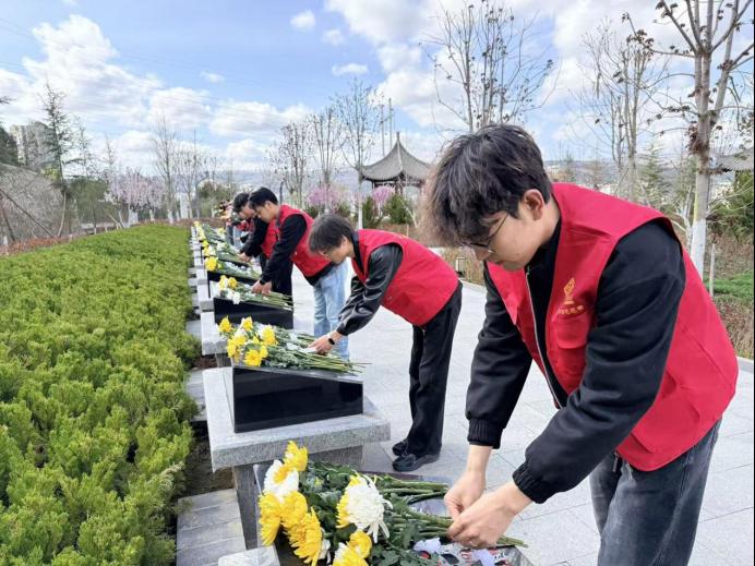 活动伊始,全体师生有序步入陵园,面向纪念碑三鞠躬。师生们缓步绕行纪念碑,瞻仰烈士名录,并来到烈士墓前,为每一座墓碑献上鲜花。大家认真擦拭墓碑,用实际行动表达对革命先烈的缅怀与敬意,在庄严肃穆的氛围中,感悟革命先烈为国家、为民族抛头颅、洒热血的崇高精神。