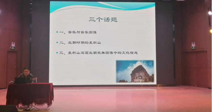 曾杰老师主要讲述了,音乐与音乐图像;北朝时期的麦积山;麦积山石窟北朝乐舞图像中的文化信息。