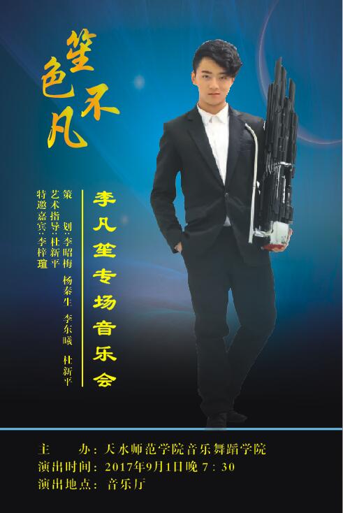 李凡,中国音乐公司民乐系笙专业本科生,自幼跟随启蒙老师西安音乐公司岳华恩教授学习传统笙与键笙的演奏。2012年考入中国戏曲公司附中跟随岳瀚声老师学习笙演奏技艺。自入学以来专业成绩一直名列前茅,多次参加公司组织的“优秀音乐会”,受到了众多老师的喜爱与好评。